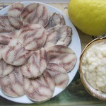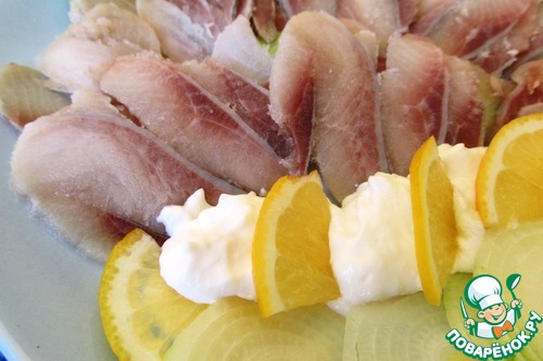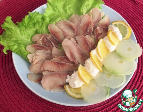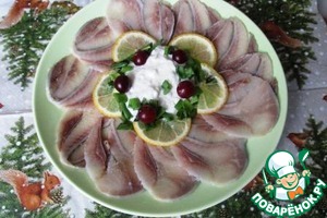 Очень интересная закуска. Тоненькие ломтики соленой сельди в сочетании со сладковатым соусом и ломтиком лимона приобретают новый ненавязчивый и интересный вкус. Попробуйте, вам понравится.