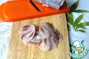 Снимаем часть пленки и на терке-слайсере строгаем селедочный рулет очень тонкими (1,5 мм) слайсами.