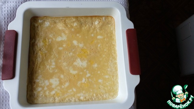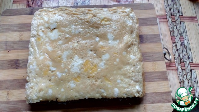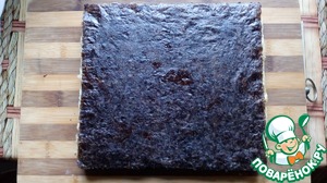 Я сделала омлет в подходящей по размеру к листкам нори прямоугольной форме. Вы можете поджарить его в сковороде и потом нарезать полосочками.