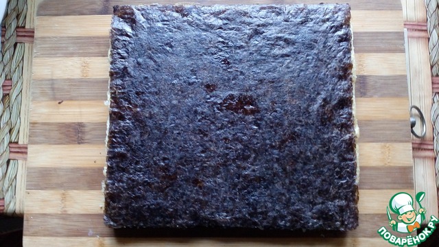Кладем следующий лист нори и прижимаем его с помощью помещенной сверху доски. На нори выкладываем рис и омлет.
