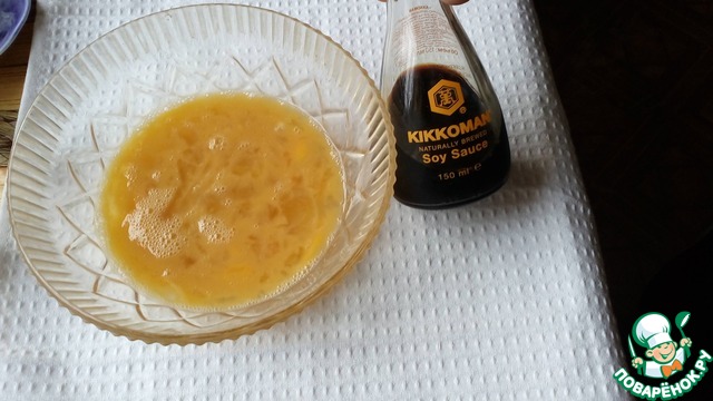 Яйца, 1 ст. л. сахара, саке и 1 ст. л. соевого соуса размешиваем вилкой до однородной консистенции. Саке можно заменить водкой. В идеале яичную смесь нужно процедить через марлю.