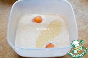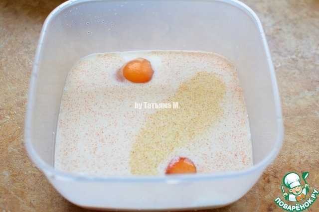 В молоко добавить яйца, соль, чеснок и паприку, размешать;