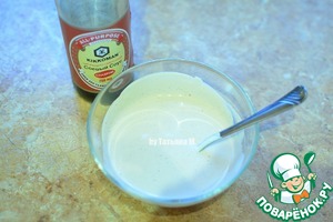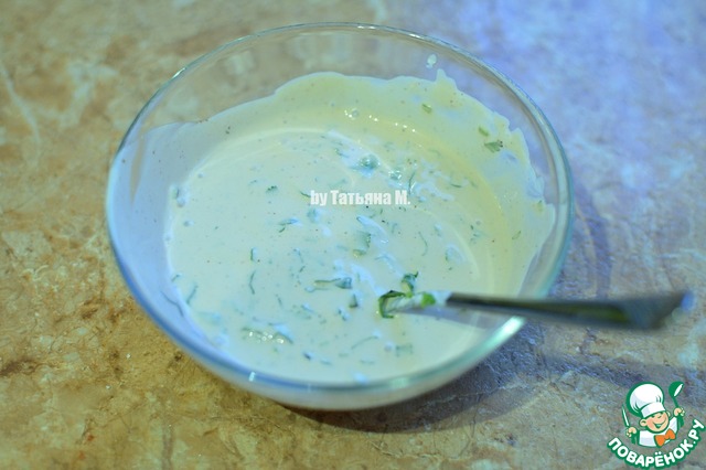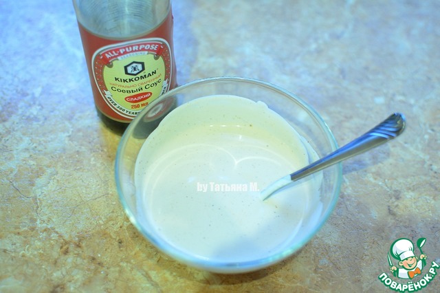 Сметану размешать с соевым соусом сладким, добавить чеснока, размешать; -