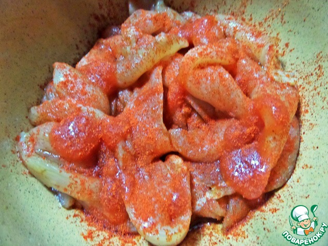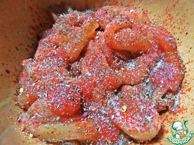 Паприку. Возможно заменить приправой для курицы, в ней тоже есть паприка, одну партию мы так и делали.