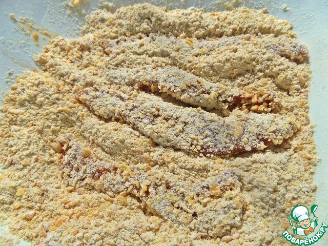 Готовим панировку. Раскрошить вначале рукой несладкие кукурузные хлопья, затем растолочь толкушкой для пюре в крошку или прокатать через полотенце скалкой. Такую панировку можно сделать заранее (или поручить детям) и хранить в закрытой коробке. У меня можете посмотреть несколько блюд на основе данной панировки.