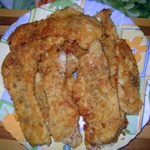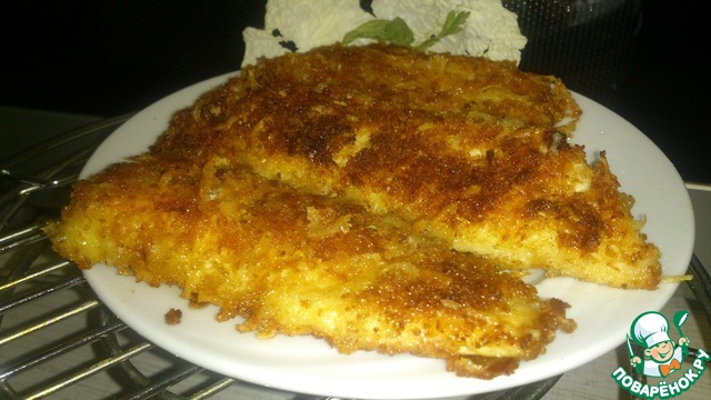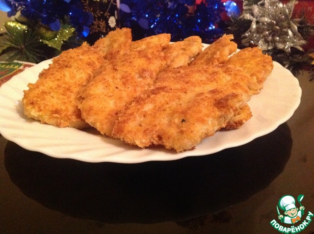 Затем обмакиваем филе во взбитое яйцо, затем в хлебно-сырную смесь, обжариваем на среднем огне с обеих сторон по 3-4 минуты с каждой стороны.