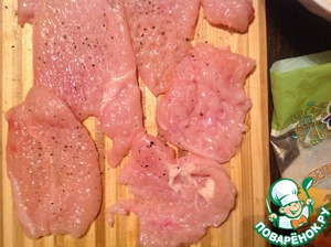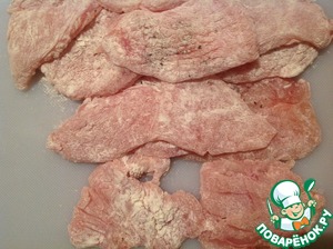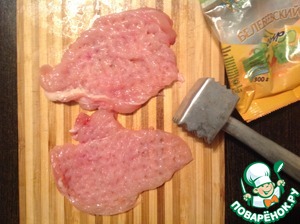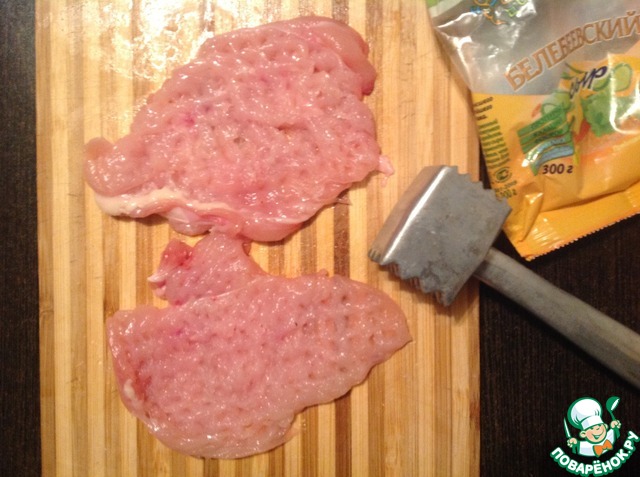Куриное филе нарежем на небольшие кусочки, слегка отобьем молотком.