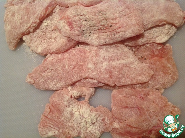 Куриное филе обвалять в муке, излишки стряхнуть. -