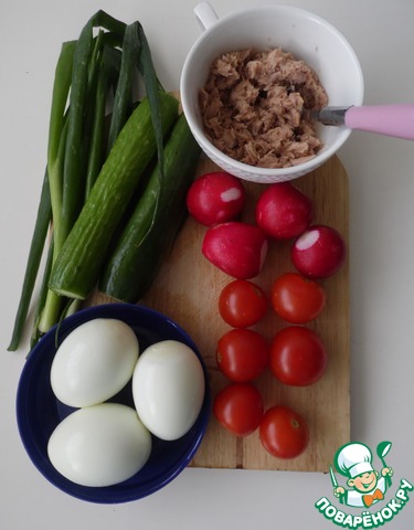 Затем поставить отварить яйца. Пока режете овощи, яйца уже будут готовы. Нарезать овощи -помидоры, огурцы, редис, зелёный лук. В глубокой посуде, всё перемешать.