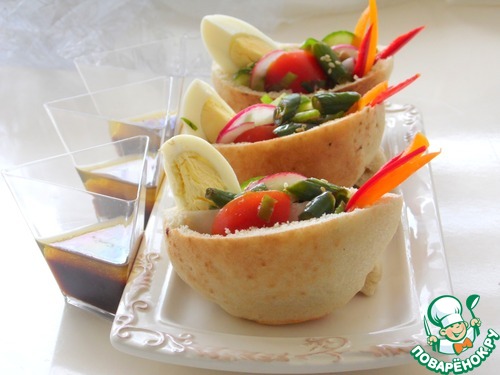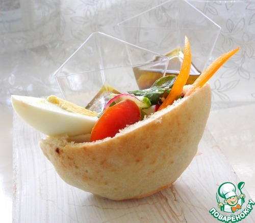 Положить 1ст. л салата в питу, четверть варёного яйца. Рядом с закуской в стаканчики заправку.