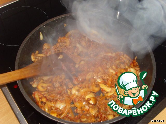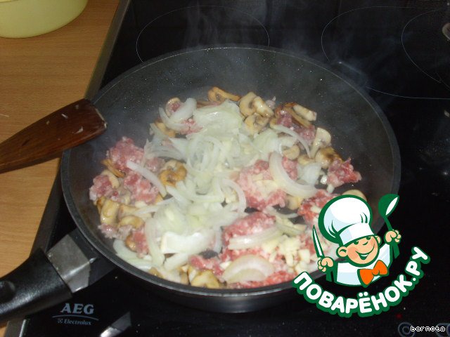 Затем добавляем фарш, лук, чеснок. И всё хорошенько перемешиваем.