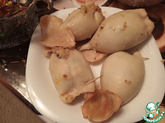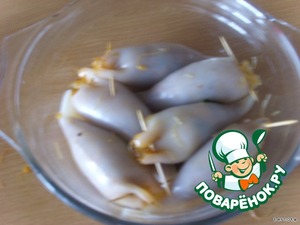 Кальмары закрепляем зубочисткой, укладываем в сотейник, предворительно смазанный маслом. Кальмары прокалываем в нескольких местах и ставим в разогретую духовку на 10-15 мин.