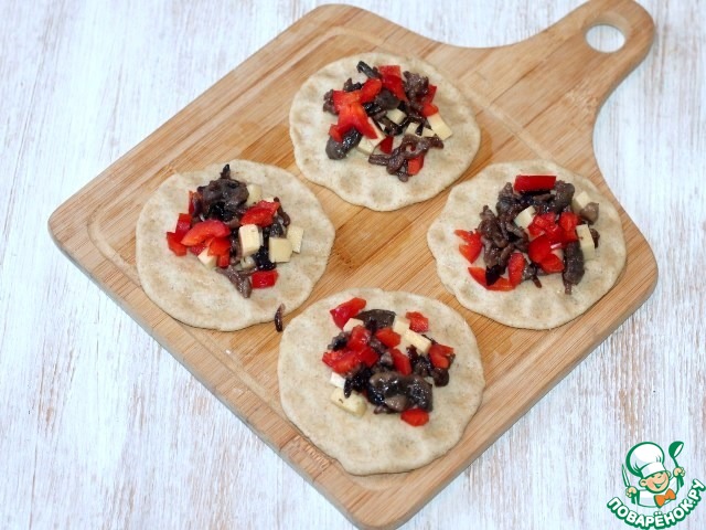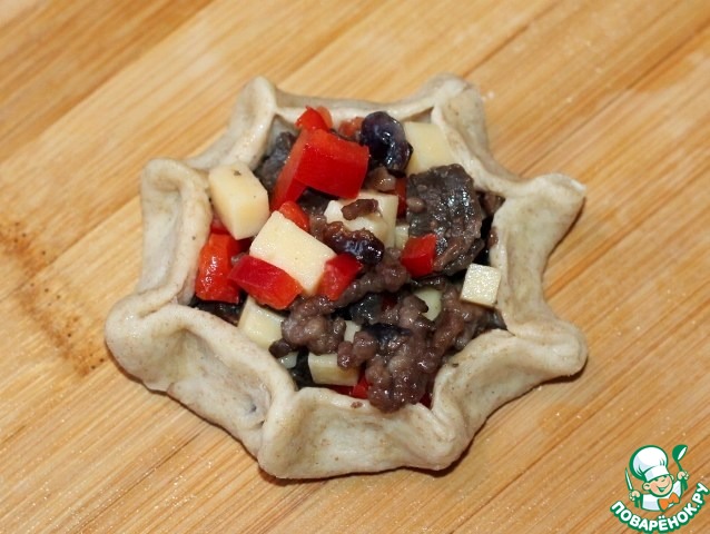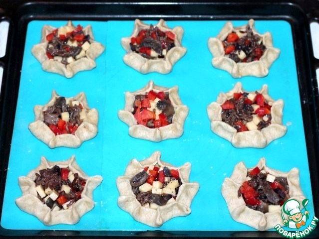 9. Переносим лепешку на противень, приподнимаем край и присбориваем, как на фото.
