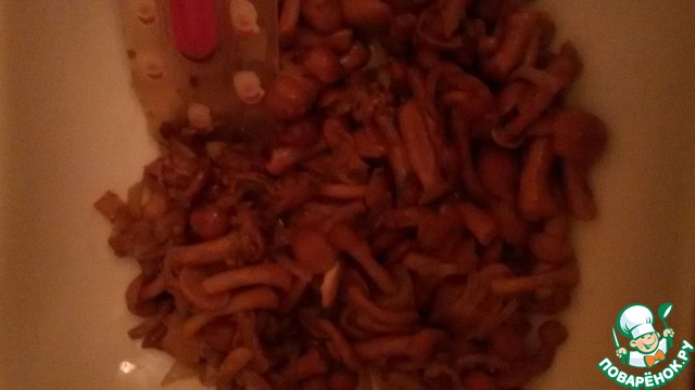 Добавить отцеженные грибы к луку и потушить их вместе с луком, постоянно помешивая. Сегодня я делала салат с опятами, но мне больше нравится вкус салата с маринованными шампиньонами