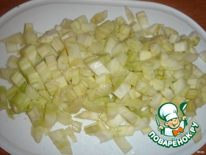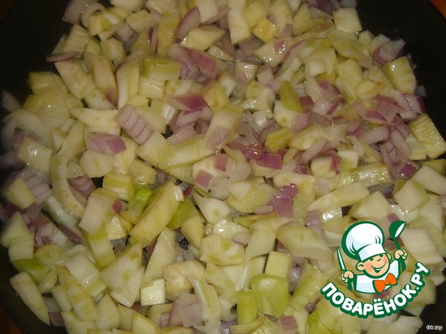 • Разогрейте масло и спассеруйте мелко порезанный лук (у меня красный) вместе с фенхелем, на умеренном огне 5 минут.