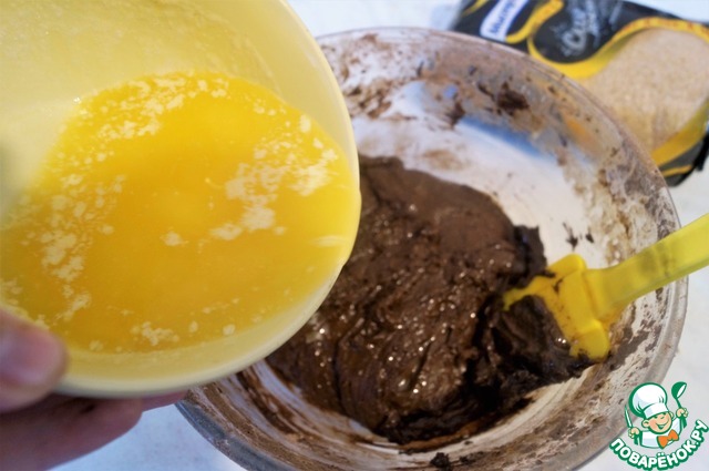 В яичную массу просеять муку и какао.