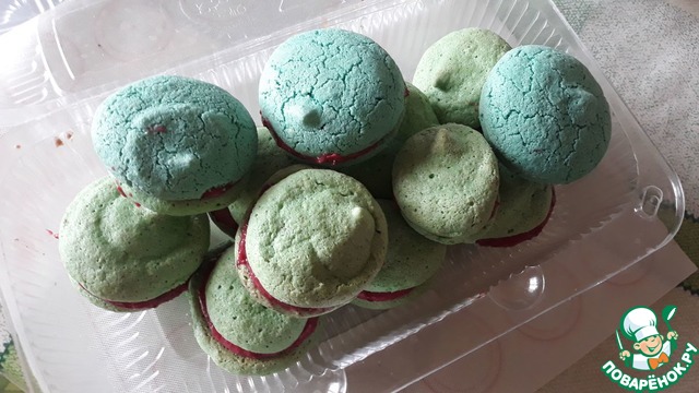 Смешайте сухую смесь со взбитыми белками. Переложите в кондитерский мешок и отсадите кружочки 3-4 см. Дайте макаронам подсохнуть около 30 минут.