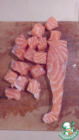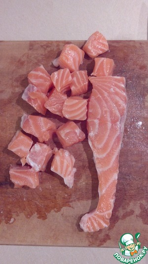 1. Очистить кусок семги от кожи и костей. Разрезать на кубики приблизительно по 1-1,5 см.