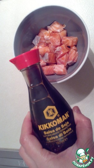 2. Залить разделанную на кусочки семгу соусом Kikkoman, добавить сок лимона и мед. Оставить мариноваться на 20-30 минут.