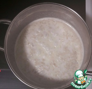 После закипания молока всыпать хлопья и варить на умеренном огне, помешивая, 5 мин. (каша должна потихоньку булькать). -