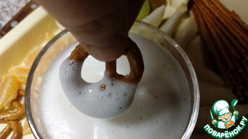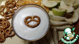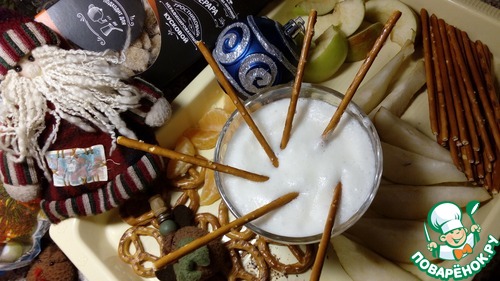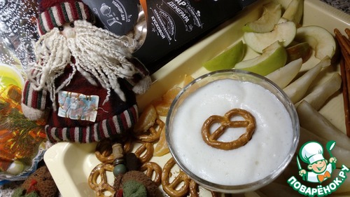 Заранее нужно позаботиться о подготовке фруктов для подачи десерта. Дип получится сладким, поэтому для "макания" очень подходят кисло-сладкие яблоки, а также крекеры, соломка, соленые крендельки.