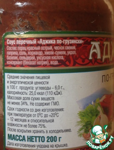 Для соуса понадобится аджика по-грузински, это острая перцовая паста густой консистенции, состав на фото, а также две стограммовых баночки детского фруктового пюре. Подойдёт любое с кисло-сладким вкусом: яблочное, как в данном случае, или со смородиной, черносливом, вишней и т. п.