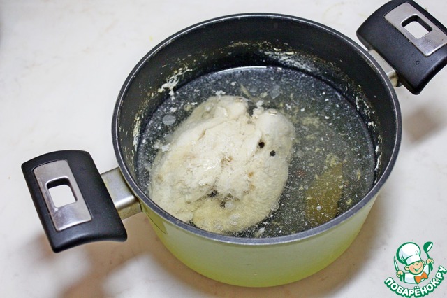 Куриное филе отварить до готовности с добавлением черного перца горошком и душистого, лаврового листа и соли. Вынуть готовую куриную грудку и остудить. Нарезать на маленькие кусочки.