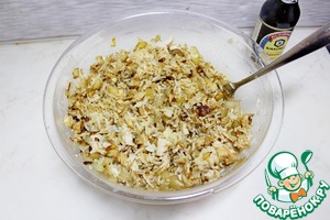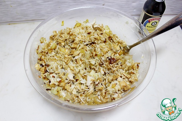 Для начинки лук нарезать мелким кубиком и обжарить на растительном масле. Смешать рис, нарезанное куриное мясо, обжаренный лук и соевый соус Киккоман, перемешать.