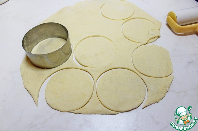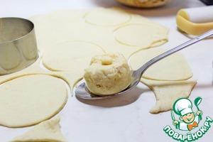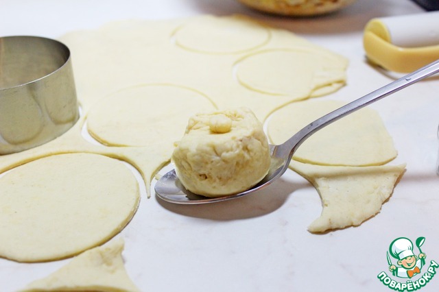 Тесто раскатать, вырезать кружки дм 8 см и 3 см дм. На больший круг теста выложить примерно 1-1,5 ч л начинки, начать защипывать края поднимая их к верху, верху положить малую лепёшку и плотно соединить её края с краями нижней лепёшки. таким образом сформировать пирожки.