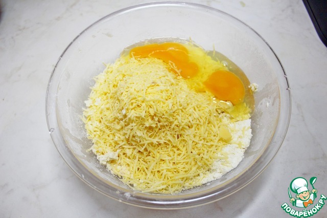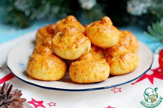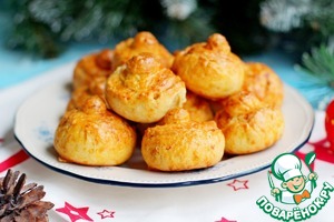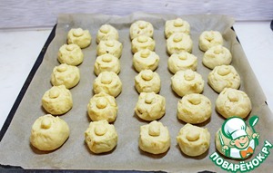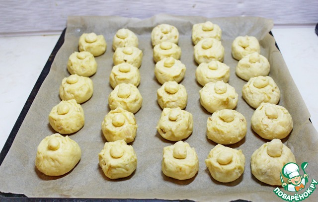 Выложить заготовки на противень, смазать смешанным желтком с молоком и поставить выпекаться в заранее разогретую духовку до 180 гр на мин 30.