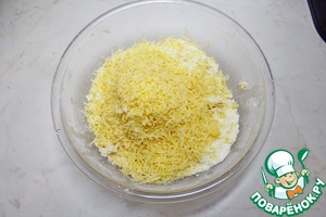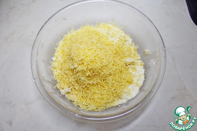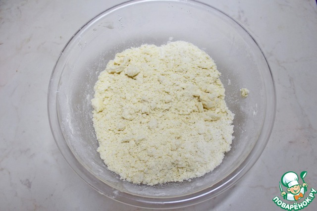 Для этого холодное сливочное масло нарезать кубиком и смешат с мукой, перетереть в крошку. -