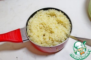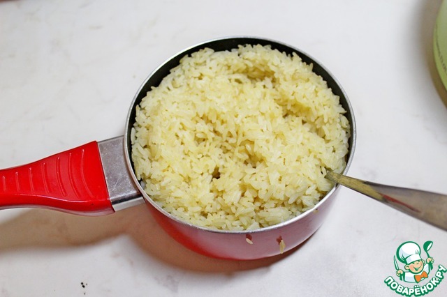 Рис отварить до готовности, приправить по вкусу, добавить сливочное масло и перемешать. Рис остудить.