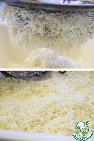 Творог (жирность не важна, но творог должен быть сухой. Это обязательно!!!) перетереть через мелкое сито. Именно перетереть! Никаких блендеров и комбайнов.