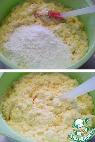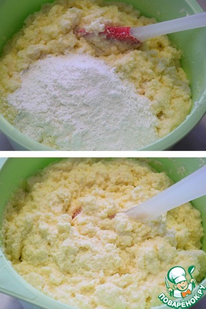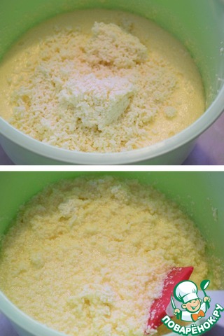 В 5-6 приемов добавляем протертый творог и аккуратно перемешиваем лопаточкой (не взбиваем!!!)