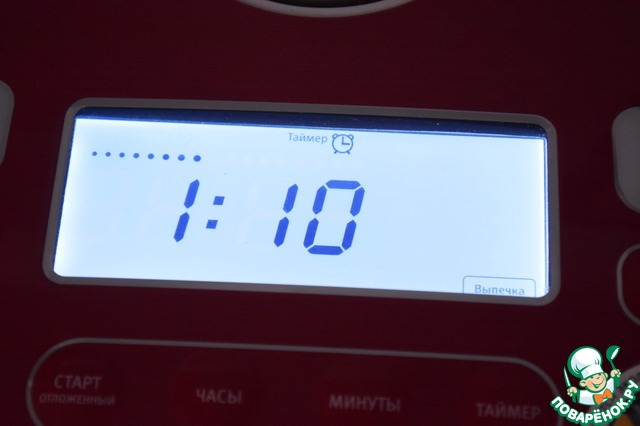 Выбираем режим "Выпечка" и выставляем - 1 ч 10 мин. Ориентируйтесь на свою МВ! Готовность проверить деревянной лучинкой - если сухая, то вынимаем.