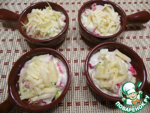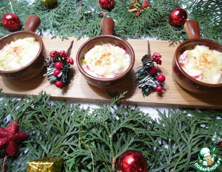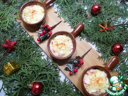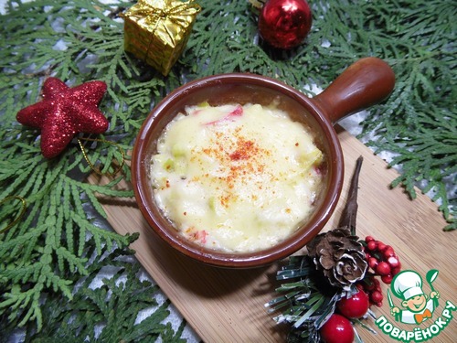 Горячая закуска - вариация на тему всеми любимого жюльена! Очень вкусное сочетание крабового мяса и лука-порея в сливочно-сырном соусе!