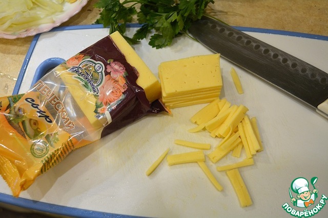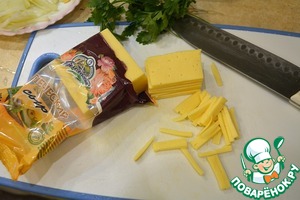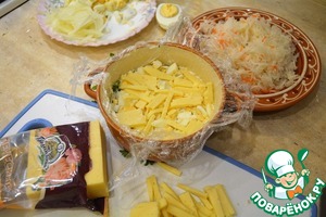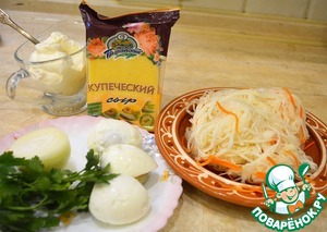 Вот наши продукты. Сыр лучше всего брать с насыщенным, богатым вкусом, не пресный - иначе он "раствориться" среди остальных вкусов. Яйца отварите заранее. Капусту можно брать как квашенную, так и маринованную. У последней вкус будет помягче.