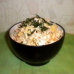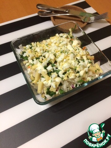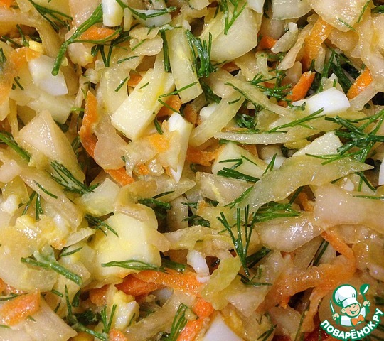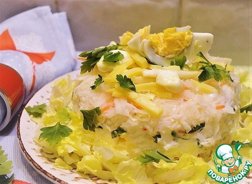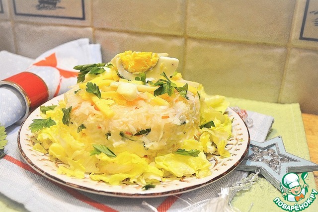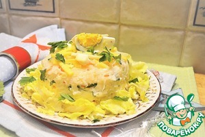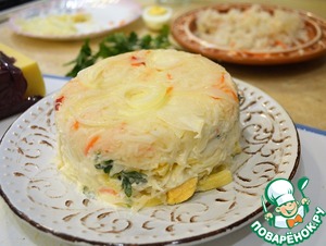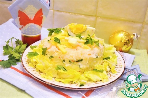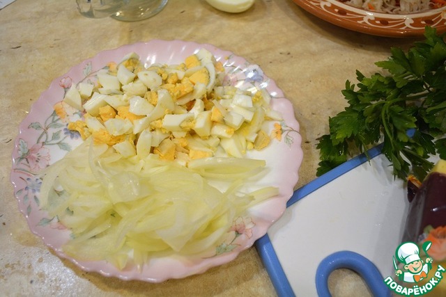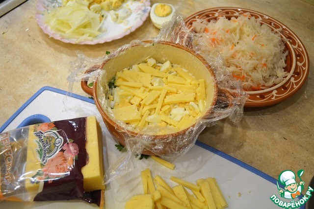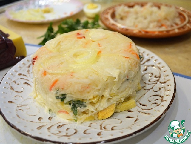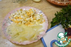 Формуем все слоями - на дно 1/2 лука... дальше 1/2 капустки, затем 1/2 яиц и сыра - не забываем периодически промазывать слои майонезом и присыпать зеленью. Хорошенько все утрамбовать.