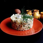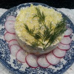 Накрываем форму сервировочной тарелкой, переворачиваем и аккуратно вытряхиваем нашу закуску. Снимаем пленку - вот такая горка у меня получилась.
