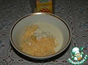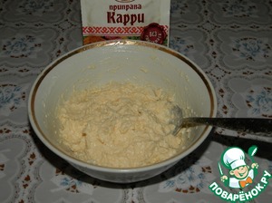 Пока поднимается тесто, приготовим начинку: 230 грамм сыра натереть на мелкой тёрке, добавить сметану, взбитую с яйцом и карри, выдавленный чеснок, перемешать.