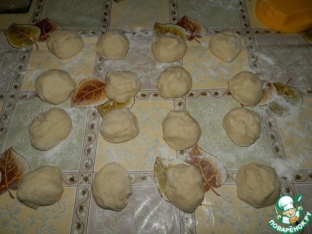 Как только тесто подойдёт, его обмять и выложить на стол, присыпанный мукой. Разделить тесто на 16 кусочков.
