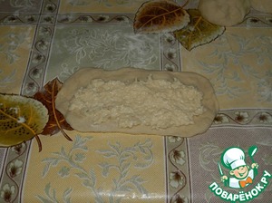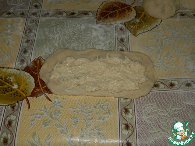 Каждый кусочек примять рукой, чтобы получился продолговатый пласт. Выложить на тесто чайную ложку начинки, немного разровнять, чуть не доходя до краёв.