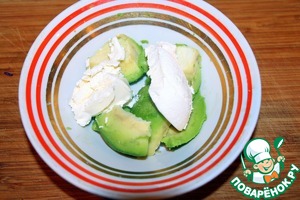 Выложить в миску авокадо и творожный сыр.