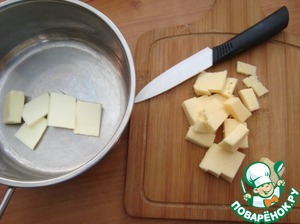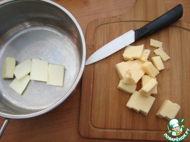 Ставим сотейник с толстым дном на плиту, масло режем кусочками и растапливаем его, понемногу, постоянно помешивая, добавляем муку. Сыр режем кусочками.