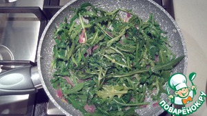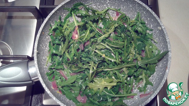 1. Нашинковать и слегка обжарить лук. Добывать рукколу и продолжать обжаривать вместе пока руккола не обмякнет.