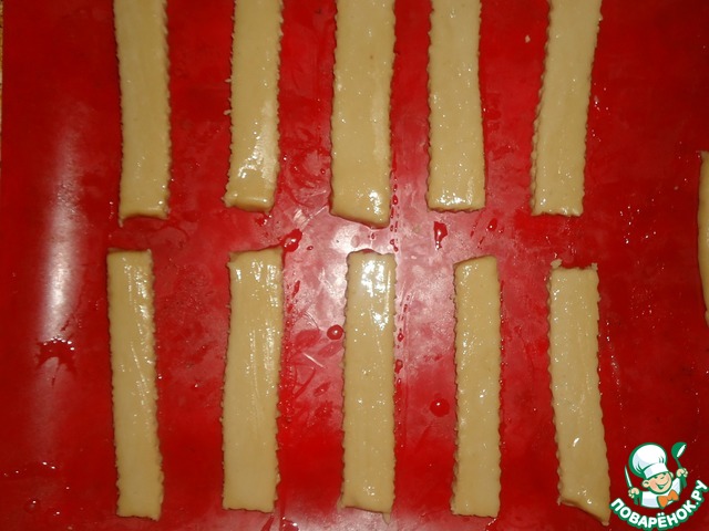 Раскатать тесто в пласт толщиной 5 мм, разрезать на полоски шириной 2 см и длиной 8-10 см.