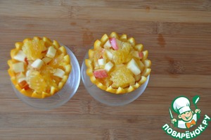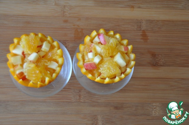 Апельсиновые чаши для удобства ставим в бокалы. Кладём в них порезанные яблоки и апельсины.