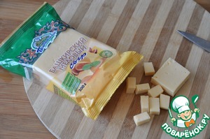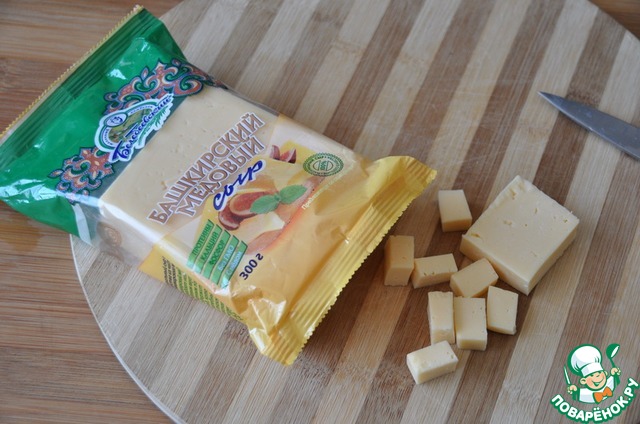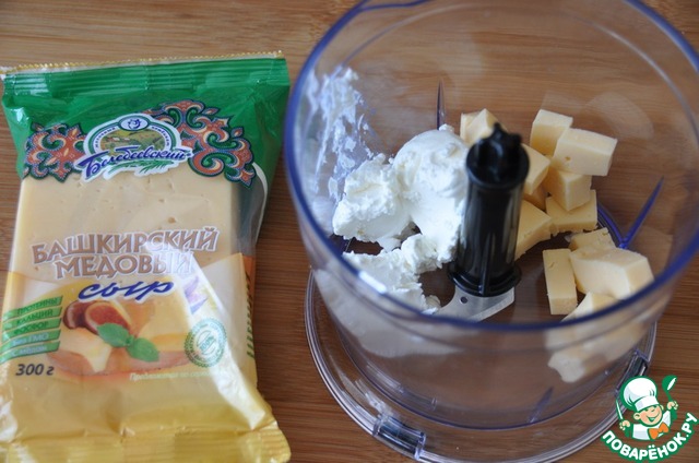 Готовим сырный крем. Для этого берём твёрдый сыр. Я выбрала "Башкирский медовый сыр" от Белебеевского молочного комбината.