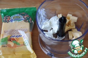 Добавляем в сырную массу мёд и апельсиновый сок (который собирали при разделке апельсина), доводим блендером до однородной кремообразной массы.