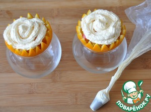 С помощью шприца или мешка с насадкой наносим сырный крем сверху яблок и апельсинов.